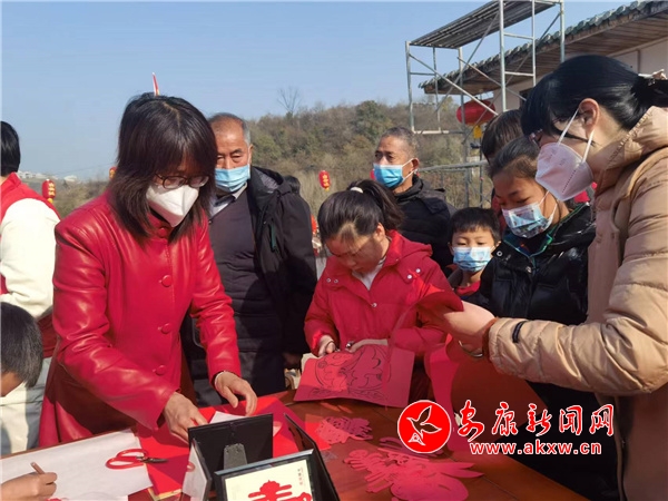 除了精彩的文藝表演,來自漢濱區(qū)文化館的駐村幫扶工作人員還組織了該館業(yè)務(wù)干部和非遺傳承人開展寫春聯(lián)、剪窗花、玩社火、印版畫、包餃子等民俗活動(dòng),讓村民們流連忘返。書法家們揮毫潑墨,以書寫春聯(lián)和“福”字的方式為村民們送上新春祝福;窗花、版畫的互動(dòng)活動(dòng)也吸引了不少村民們的駐足圍觀,來自漢濱區(qū)文化館的文化志愿者們現(xiàn)場(chǎng)示范講解,一幅幅精美的作品在他們手中呈現(xiàn),有的還沒完工,就已被圍觀的村民們搶先預(yù)定……