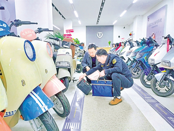 ①執(zhí)法人員檢查電動自行車配件。席瑾 攝②向電動自行車銷售人員了解情況。席瑾 攝本網(wǎng)訊(通訊員 柯賢會 喬。罢埑鍪倦妱幼孕熊嚭细褡C件!薄按蜷_蓋板,看看……