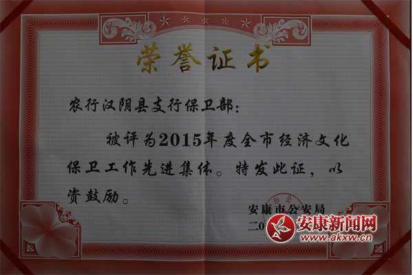 2015年,漢陰縣支行按照“預防為主、單位負責、突出重點、保障安全”的方針,積極開展“平安單位”創(chuàng)建活動,落實主體責任,健全安全制度,不斷增強全員的責任意識和安防意識,著力提升全行安全管理水平,連續(xù)多年保持安全經(jīng)營無事故、無案件。