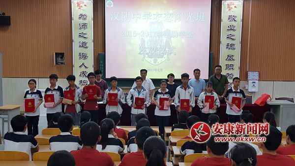 安康新聞網(wǎng)訊(通訊員 涂紅蓮)6月20日下午兩點,漢陰中學首屆“衣戀陽光班”2016-2017學年助學金發(fā)放儀式在該校階梯教室隆重舉行。市縣慈善協(xié)會、縣教體局、漢陰中學相關領導出席,50名品學兼優(yōu)的受助貧困學生參加發(fā)放儀式。