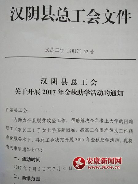 安康新聞網(wǎng)訊(通訊員 儲(chǔ)毅)為助力全縣脫貧攻堅(jiān)工作,幫助解決今年考上大學(xué)的困難職工(農(nóng)民工)子女上學(xué)實(shí)際困難,提高工會(huì)困難幫扶工作精準(zhǔn)化服務(wù)水平。日前,漢陰縣總工會(huì)印發(fā)了《關(guān)于開展2017年金秋助學(xué)活動(dòng)的通知》。