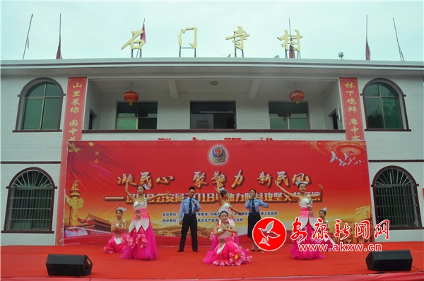 活動(dòng)對(duì)石門寺村涌現(xiàn)出的3名優(yōu)秀共產(chǎn)黨員、3名脫貧攻堅(jiān)自強(qiáng)標(biāo)兵、3名文明衛(wèi)生示范戶、2名好婆婆和2名好媳婦進(jìn)行了表彰;顒(dòng)文藝節(jié)目演出在舞蹈《盛世歡歌》中拉開序幕,巡特警大隊(duì)民警表演的《擒敵拳》《硬氣功》,虎虎生威、技驚四座,讓群眾見證了漢陰公安維護(hù)平安的本領(lǐng)和力量;交警大隊(duì)表演的《交警指揮手勢(shì)操》整齊劃一,既向群眾宣傳了交通安全知識(shí),又體現(xiàn)了交警規(guī)范執(zhí)法執(zhí)勤水平;在《警犬演練》中,警犬歐巴、華仔登場(chǎng),分別進(jìn)行了服從、搜毒、反暴恐等科目表演,展現(xiàn)了漢陰公安警犬中隊(duì)從無到有、從有到精的變化;巡特警大隊(duì)民警劉鵬表演的獨(dú)唱《父親》和城關(guān)派出所民警表演的三句半《警民共奏扶貧曲》情感豐富、寓教于樂,深受群眾喜愛;歌舞《陜南民歌聯(lián)唱》和《漢陰,我可愛的家鄉(xiāng)》,歌聲悠揚(yáng)、舞姿優(yōu)美,贏得現(xiàn)場(chǎng)觀眾陣陣掌聲。