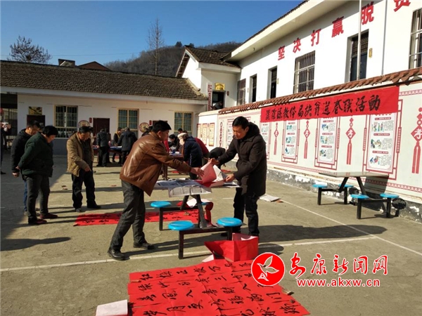 從1月22日開始,教體局組織黨員干部深入幫扶貧困村,為貧困戶義寫春聯(lián)活動(dòng),將春聯(lián)送到貧困戶手中。書法家們現(xiàn)場(chǎng)揮毫潑墨、筆走龍蛇,領(lǐng)取春聯(lián)的村民接踵而來,整個(gè)村部洋溢著濃郁的節(jié)日氣息,紅紅的春聯(lián)、濃濃的祝福,映紅了張張笑臉,溫暖了貧困戶的心窩。貧困戶紛紛稱贊,以前春聯(lián)都是街上買的,教體局組織送春聯(lián)活動(dòng),感覺味道不一樣,心里高興,感謝國(guó)家好政策,不忘黨和政府的關(guān)懷,從書法家們的書法作品中汲取力量,在黨的十九大春風(fēng)吹動(dòng)下,奮力脫貧致富,建設(shè)美好的新生活。“脫貧攻堅(jiān)送來黨的溫暖,幫村聯(lián)戶譜寫致富新篇”、“新時(shí)代迎來新氣象,新作為結(jié)出新成果”……一副副墨寶飄香的春聯(lián),寫出了村民對(duì)新的一年的期盼,描繪了大家對(duì)脫貧致富美好生活的憧憬和向往。