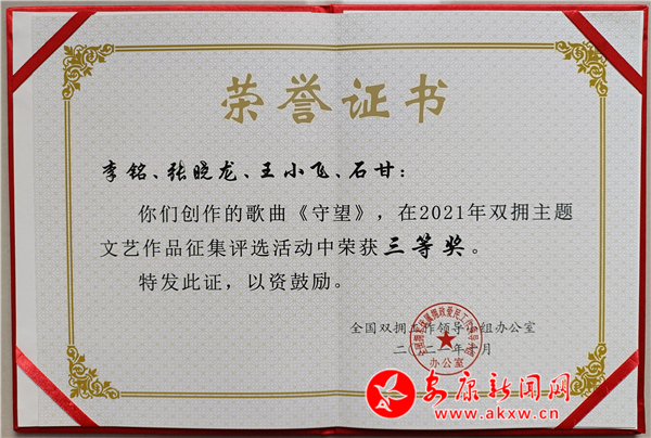 本網(wǎng)訊(通訊員 歐定揚(yáng))漢陰縣文旅廣電局文化干部李銘與其戰(zhàn)友創(chuàng)作的歌曲《守望》榮獲2021年度全國(guó)雙擁主題歌曲征集三等獎(jiǎng),據(jù)了解,這也是近幾年來漢陰縣在雙擁和文化宣傳工作上所獲得的又一獎(jiǎng)項(xiàng)。
