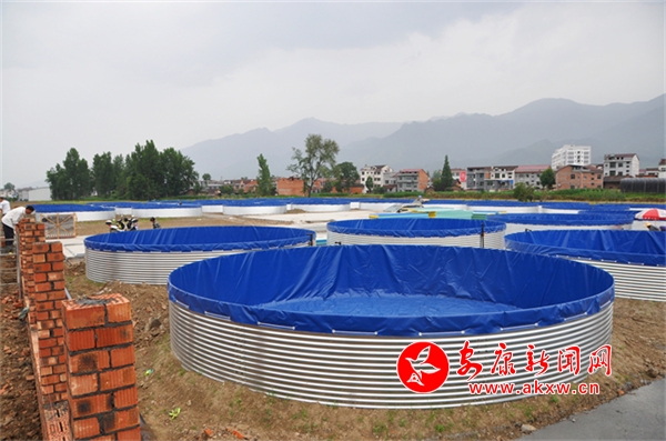 在項(xiàng)目建設(shè)現(xiàn)場,60個(gè)直徑8米高1.5米的圓形水池已經(jīng)建好,一個(gè)個(gè)用鐵皮圍成的藍(lán)色圓桶很是顯眼。“這種水池外圈都是由不銹鋼圍成的,里面是用藍(lán)色防水布包裹。”劉光興指著水池說:“這個(gè)鄉(xiāng)村振興項(xiàng)目是陸基圓桶型高位養(yǎng)魚池,主要利用洞河水庫庫區(qū)下游優(yōu)質(zhì)水資源來養(yǎng)殖匙吻鱘、黃辣丁、鱸魚等中高端暢銷品種。采取的是循環(huán)水養(yǎng)魚新模式,優(yōu)勢是流水養(yǎng)魚、品質(zhì)好,還減少了人力和養(yǎng)殖成本,提高科學(xué)化管理水平。6月底前,就能建成使用。”