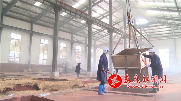 在漢陰縣雙乳鎮(zhèn)三同村頤品莊園酒廠標(biāo)準(zhǔn)化廠房車間里,工人們來回穿梭,在各自崗位上抓生產(chǎn)、趕進度。釀酒車間里,新出爐的酒糟熱氣騰騰,工人們快速將其攤晾,冷卻后又開始揮鏟拌曲,進入下一輪的裝窖發(fā)酵;蒸鍋旁,工人鉚足干勁,一層一層均勻加料上甑,熟練地進行各項工序。
