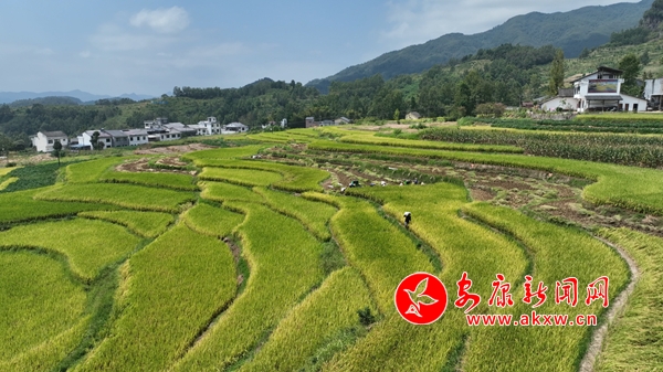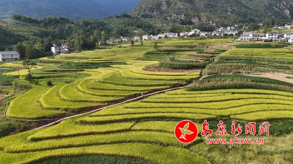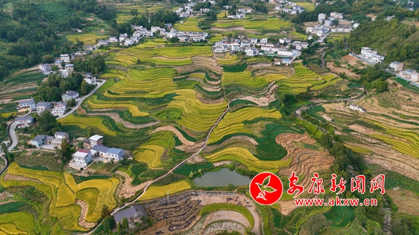 鳳堰梯田的1.2萬畝連片水稻迎來了豐收季,蜿蜒盤旋的金黃色線條從山腳盤繞至山腰,層層疊疊的稻田與整潔的村莊、蜿蜒的道路、遠方的青山相映成趣,美不勝收。農戶們也搶抓晴好天氣,確保顆粒歸倉,勤勞的鄉(xiāng)親們穿梭在稻田中,構成了一幅祥和而廣闊的秦巴山區(qū)農耕文明美麗畫卷。