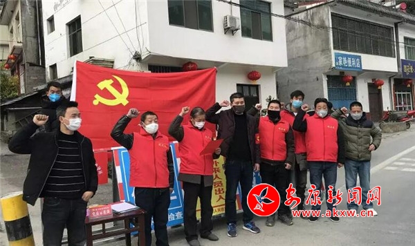 “我宣誓,我志愿加入新型冠狀病毒肺炎阻擊戰(zhàn),堅(jiān)決貫徹習(xí)近平總書(shū)記關(guān)于疫情防控重要指示精神,全面落實(shí)黨中央和省市縣委決策部署,聽(tīng)從指揮,服從安排,義無(wú)反顧,不懼困難,堅(jiān)守陣地,積極工作,為全面打贏疫情防控阻擊戰(zhàn)獻(xiàn)出全部力量!”在城關(guān)鎮(zhèn)17個(gè)臨時(shí)黨支部,紅色黨旗飄揚(yáng),黨員舉起右手宣誓,志愿為本次疫情防控狙擊戰(zhàn)貢獻(xiàn)出全部力量。