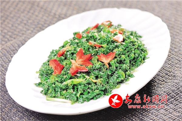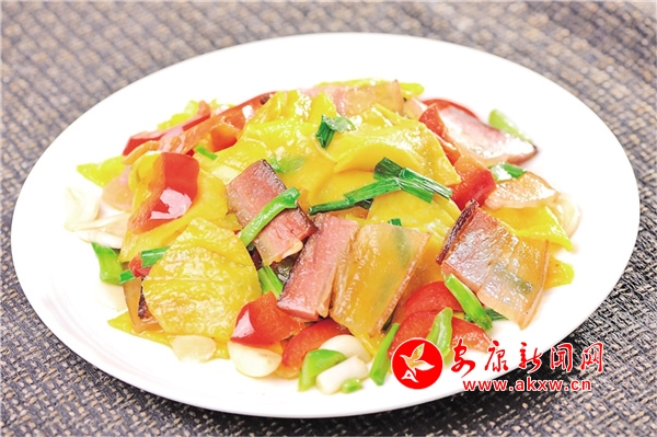 蛋皮炒臘肉是土生土長的嵐皋菜.烹飪好的蛋皮炒臘肉色香味俱全。如黃金般閃耀的蛋皮、臘肉與如翡翠般碧綠的韭菜、青椒相得益彰,勾引著人的食欲。入口更有絲絲縷縷的濃香和淡辣,自齒喉彌漫而下,久久縈繞回蕩于五臟六腑間,讓人吃了還想吃,吃了便永生難忘。