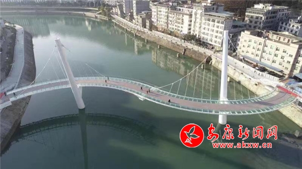 無(wú)人機(jī)拍攝的剛建成的嵐皋縣城嵐河人行橋。陳延安/攝