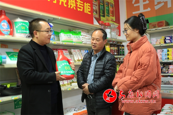 11月28日,王江灃(左)給陳吉普(中)和劉冰冰(右)介紹小區(qū)“愛心超市”積分兌現(xiàn)情況。陳延安/攝
