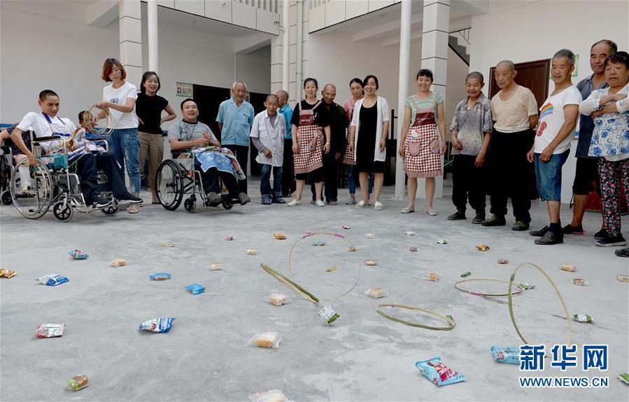 寧陜縣中心敬老院五保失能托養(yǎng)中心內(nèi),托養(yǎng)人員在一起進行套圈游戲(8月20日)。 自2016年9月起,陜西寧陜縣開始實行貧困失能、半失能人員集中供養(yǎng),為其提供干凈舒適的住所、24小時全面護理,不僅讓貧困失能、半失能人員得到良好照料,也徹底將失能家庭解放出來,全身心脫貧致富奔小康。目前,寧陜登記在冊貧困失能、半失能人員共有467人,其中320人已分別在全縣4個敬老院的五保失能托養(yǎng)中心內(nèi)進行集中供養(yǎng),剩余人員將于托養(yǎng)中心床位逐步完善后全部入住。 新華社記者 劉瀟 攝