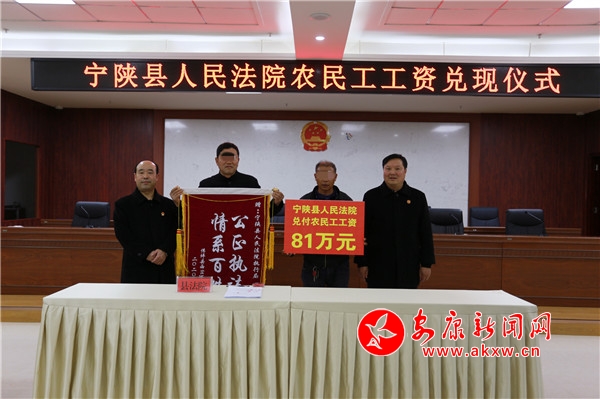 2020年11月25日,當接到寧陜法院執(zhí)行局領取工資的通知后,崔某激動不已,一大早從佛坪縣西岔河鎮(zhèn)趕到寧陜法院,領取了全部案款812943元,并當庭贈送錦旗一面,上書“公正執(zhí)法、情系百姓”,他連連說:“真心感謝寧陜法院,幫我要回了拖欠的工資”。