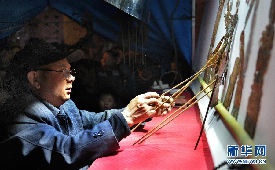 3月15日,平利縣國家非遺文化傳承人吳承權(quán)在縣城中心廣場為群眾表演弦子腔。新華社記者 陶明 攝