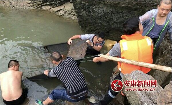 當(dāng)日下午16:00時(shí)許,石泉縣水利局接舉報(bào)稱石泉水庫(kù)大壩下有人非法電魚(yú)消息后,當(dāng)即指派漁政執(zhí)法人員前往查處。經(jīng)現(xiàn)場(chǎng)查看,水庫(kù)大壩下卻有一疑似捕魚(yú)船只在壩下江面游弋,行跡十分可疑。由于大壩下游山體險(xiǎn)峻,執(zhí)法人員只好采取一邊分組盯守,一邊通知相關(guān)人員準(zhǔn)備橡皮伐及攀巖工具。于此同時(shí),城關(guān)派出所民警也聞?dòng)嵆鼍M(jìn)行現(xiàn)場(chǎng)警戒,并共同商議行動(dòng)方案。執(zhí)法人員決定冒險(xiǎn)分兩組分別向非法捕撈嫌疑人藏匿地點(diǎn)靠攏。一組劃橡皮伐由漢江左岸向壩基右岸靠攏,一組由右岸峭壁攀巖而下,由于灘險(xiǎn)流急,崖高壁陡,兩組人員行進(jìn)都十分困難且相當(dāng)危險(xiǎn),稍有不慎就有墜河跌崖的危險(xiǎn)。當(dāng)執(zhí)法人員抵達(dá)右岸壩基時(shí),非法捕撈嫌疑人早已利用熟悉地形和水性好的優(yōu)勢(shì)先將船只灌水沉入江中后,又將漁具藏匿后選擇隱蔽路線逃之夭夭。經(jīng)執(zhí)法人員進(jìn)行近一個(gè)小時(shí)的仔細(xì)搜索,終于在壩基右岸一巖壁下十分隱蔽的水灘里發(fā)現(xiàn)了沉入水下的船只。由于船只藏匿地地勢(shì)險(xiǎn)要,且水下水情不明,執(zhí)法人員幾經(jīng)試探后,才小心謹(jǐn)慎的潛入水下將沉船拖出水面。現(xiàn)場(chǎng)共收繳電瓶等非法捕撈漁具10余件,漁獲物40余斤。
