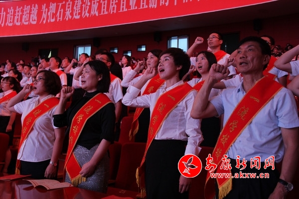 演出現(xiàn)場(chǎng),對(duì)石泉中學(xué)等10 個(gè)“一流教育質(zhì)量單位”,李超旗等10名一流學(xué)校校長(zhǎng),陳興蘭等30名“一流教學(xué)能手”,楊細(xì)雨等50 名“三愛(ài)標(biāo)兵”進(jìn)行了表彰獎(jiǎng)勵(lì),2019年新入職的教師代表進(jìn)行了宣誓,老教師重溫了誓詞。