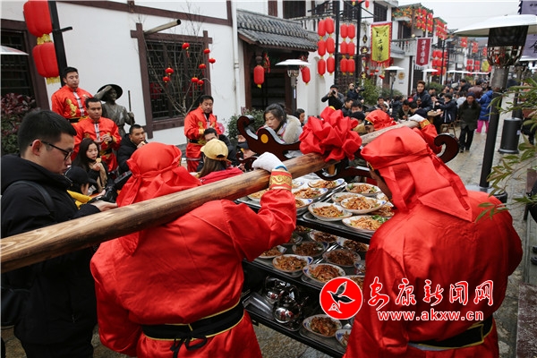 庖湯會(huì)菜品28道,八涼六熱十二道蒸菜兩道湯。美食不斷登場(chǎng)上桌的同時(shí),兩名披紅掛彩的當(dāng)?shù)匦』镒釉谘缦习ぷ辣硌蓐兡细鞣N花拳,把庖湯會(huì)的氣氛推向高潮。古鎮(zhèn)長(zhǎng)街、方桌條凳、游客們和當(dāng)?shù)厝罕妵谝黄穑似鸫蠛谕,喝一口自釀美酒、吃一塊當(dāng)?shù)刎i肉、劃一局石泉花拳。