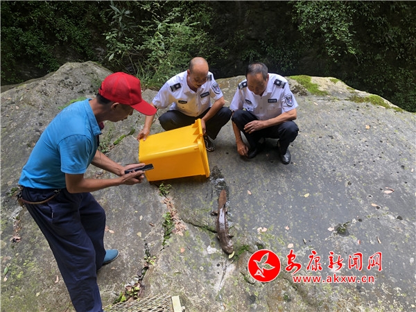 “為了保護漁業(yè)資源和水生態(tài)環(huán)境,我們今天把這條娃娃魚放歸到喜河鎮(zhèn)三星潭流域(雁山瀑布景區(qū)安全水域)。這里屬于保護區(qū),且原生態(tài)自然環(huán)境非常適宜娃娃魚生長。”石泉縣農業(yè)綜合執(zhí)法大隊干部劉晨說道。