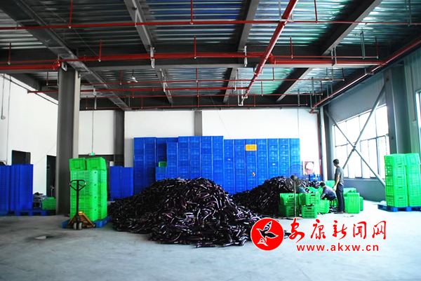 圖為豐產期的紫皮長茄被堆放在倉儲車間