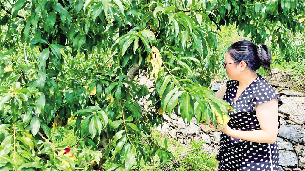 穿過(guò)村莊,山坡上500畝桃園綠意盎然。基地負(fù)責(zé)人伍娟與工人正采摘套袋。“2017年建設(shè)的桃園,今年雖受旱情影響,產(chǎn)量仍達(dá)30萬(wàn)斤,產(chǎn)值約300萬(wàn)元。”