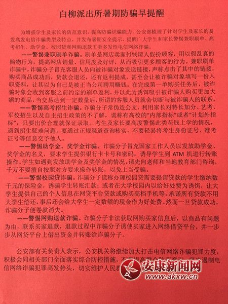 安康新聞網(wǎng)訊(通訊員 康倩)暑假,本是學(xué)生放松與家人相聚的溫馨時(shí)刻,但年年暑假都有很多不法分子,鉆了學(xué)生涉世未深,輕易相信他人的空子,對(duì)學(xué)生實(shí)施諸如發(fā)放助學(xué)金、暑期兼職等類(lèi)型的電信詐騙。對(duì)此白柳派出所專(zhuān)門(mén)針對(duì)此類(lèi)電信詐騙在轄區(qū)進(jìn)行了廣泛宣傳,不僅學(xué)生需注意,家長(zhǎng)更需警惕。