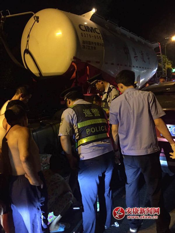 7月21日晚23時(shí)許,旬陽縣公安局巡警大隊(duì)康華園巡邏民警接到過路的群眾報(bào)警,稱:城區(qū)周家溝附近有交通事故,可能有人受傷。民警立即趕往事發(fā)地點(diǎn),沿途發(fā)現(xiàn)交通以堵塞,長(zhǎng)長(zhǎng)的車隊(duì)一眼望不到頭,趕到事發(fā)地點(diǎn)后,發(fā)現(xiàn)一油罐車車底躺著兩個(gè)人,一男一女系夫妻關(guān)系,女子的腿部受傷嚴(yán)重,不能移動(dòng),當(dāng)民警趕到現(xiàn)場(chǎng)后,交警以及救護(hù)車隨后趕到,巡邏民警配合救護(hù)人員將躺在油罐車下的兩人救出,及時(shí)送往醫(yī)院救治。