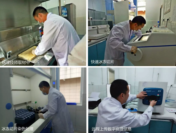 病理科工作人員快速接收標(biāo)本、取材、冰凍制片、標(biāo)本染色、將標(biāo)本切片插入遠(yuǎn)程醫(yī)療數(shù)字病理掃描系統(tǒng)進(jìn)行掃描讀片,掃描系統(tǒng)實(shí)時(shí)將切片信息同步傳輸至安康市中醫(yī)醫(yī)院病理遠(yuǎn)程診斷中心。