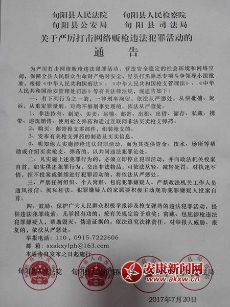 安康新聞網(wǎng)訊(通訊員 ?担7月20日,旬陽(yáng)警方聯(lián)合法、檢、司部門(mén)共同發(fā)布了《關(guān)于嚴(yán)厲打擊網(wǎng)絡(luò)販槍違法犯罪活動(dòng)的通告》。從該縣警方了解到,發(fā)布此次《通告》……