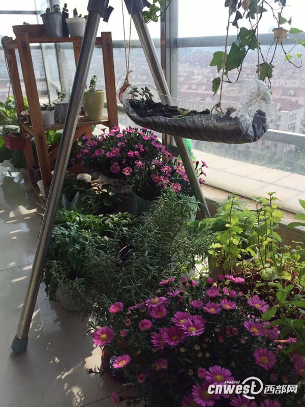 OO在陽臺上種了不少花花草草和蔬菜。