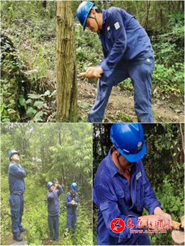 在悶熱難耐的綠樹山林間,他們頭戴藍(lán)色的安全帽,身著長袖長褲的工作服,不停揮舞著砍刀、電鋸,背上被浸濕的水跡,已分不清是汗水還是雨水,木屑飛舞,刀起刀落,伴隨著“轟轟轟……”的聲音,一顆顆超高樹木倒下,一條條線路通道暢通了。這不辭辛勞、團(tuán)結(jié)合作的工作場景幾乎每天都能在山林里看到。