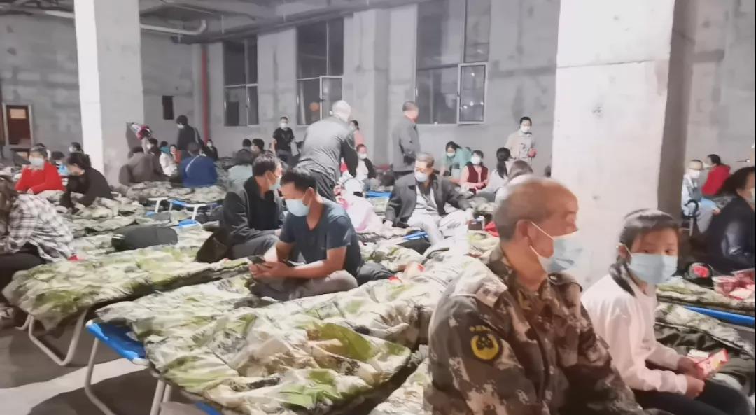 夜晚的廣場臨時安置點一樓燈光點點,走進屋內(nèi),一排排迷彩顏色的簡易床和應急物資映入眼簾,一個個公安民警、醫(yī)護人員、網(wǎng)格員和志愿者的身影在屋內(nèi)屋外忙碌地穿梭,為群眾搭建了一個暖心之家,從周邊社區(qū)隱患點撤離的居民就在這里臨時居住。