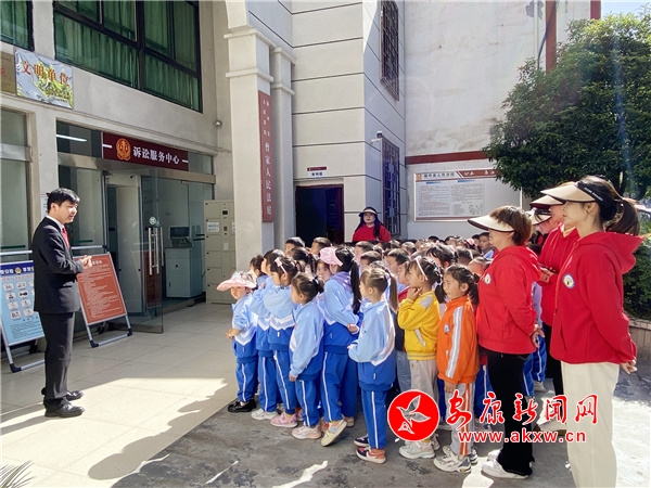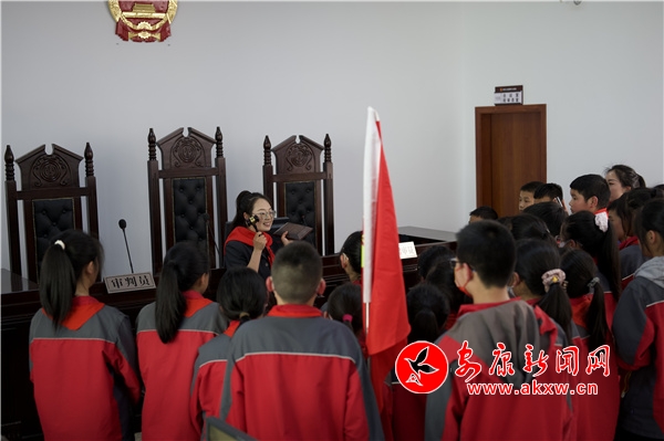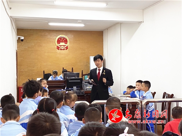 在參觀過程中,干警帶領(lǐng)同學(xué)們走進訴訟服務(wù)中心和干警辦公室了解了法院干警的工作場所。隨后,帶領(lǐng)同學(xué)們參觀審判庭,現(xiàn)場向同學(xué)們介紹科技審判法庭的功能及庭審流程,并展示了法袍、法槌和法徽,同時用深入淺出的語言和提問互動的方式向孩子們講解了法袍、法槌和法徽的象征意義,同學(xué)們興趣濃厚,紛紛走上審判臺,親身感受和觸摸審判設(shè)施,感受法庭審判的嚴(yán)肅和莊重。
