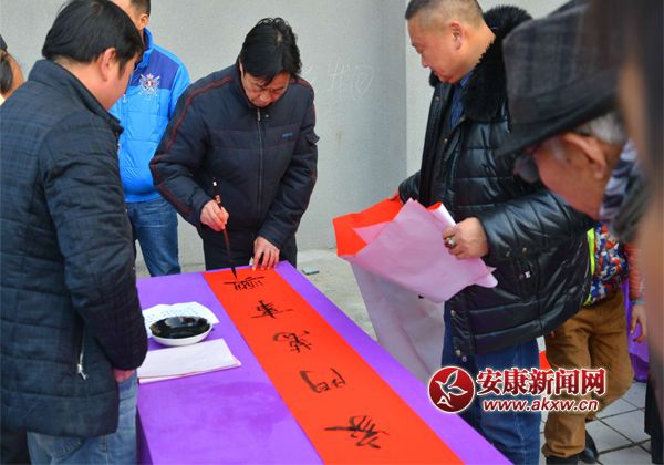 在廣場入口處,4名中青年書作者正揮毫潑墨,為居民義寫春聯(lián)。“喜居寶地千年旺,福照家門萬事興”,一位社區(qū)居民從書畫家趙剛?cè)A手中接過春聯(lián),小心翼翼地攤晾在平地上。據(jù)統(tǒng)計,當(dāng)天共為居民書寫春聯(lián)300余副。