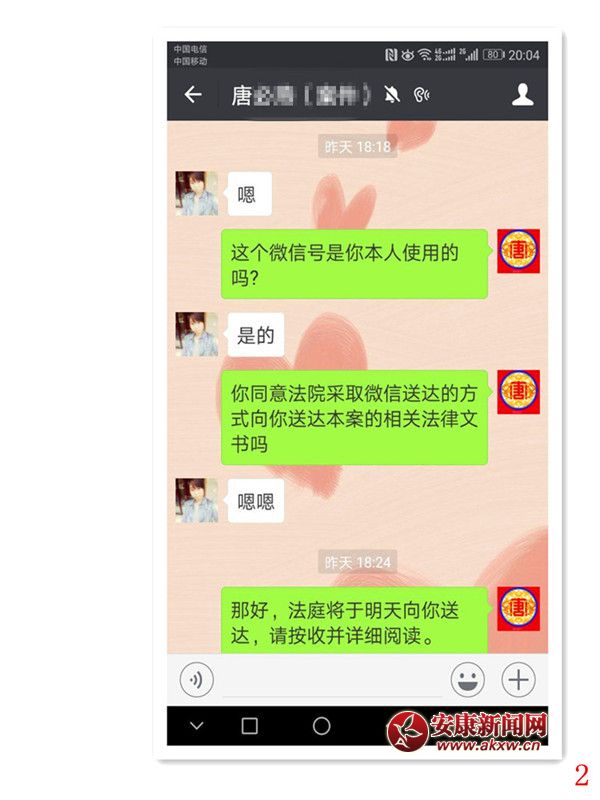 安康新聞網(wǎng)訊(通訊員 翁雪)微信送達(dá)訴訟文書,成為新形勢下加強(qiáng)人民法院與當(dāng)事人之間溝通交流、化解糾紛的一種快捷便利手段,大大節(jié)省了訴訟成本和時間,這是紫陽法院在訴訟文書送達(dá)方面靈活、務(wù)實、高效的又一探索。承辦法官只需手指輕點,即向案件當(dāng)事人發(fā)出“微信傳票”,不到十秒時間,對方立即回復(fù):“收到。”這就是紫陽法院第五審判團(tuán)隊向唐某與楊某離婚案件當(dāng)事人成功送達(dá)開庭傳票的情景。