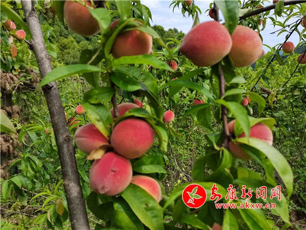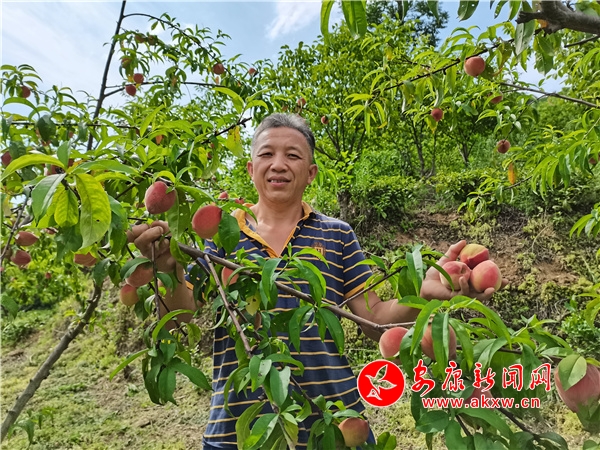 “當下正是蜜桃的最佳采摘期,我們這里生態(tài)好,植被覆蓋率高、水資源豐富,氣候適宜,在這樣自然條件下生長出來的果子是純天然、無污染、原生態(tài)的。你看,這些果子顆顆飽滿,個頭均勻,肉厚核小,口感香甜多汁,且采摘持續(xù)時間長,可以采摘到七月下旬”。為了讓大家吃到品質(zhì)好的桃,我和妻子參加了鎮(zhèn)農(nóng)綜站牽頭的種植、養(yǎng)殖培訓,在他們的指導下熟練的掌握了種養(yǎng)技術。通過控制掛果密度讓每個果子充分享受陽光和養(yǎng)分,這樣才能結出又甜又好的果子。”種植大戶胡小飛介紹說。