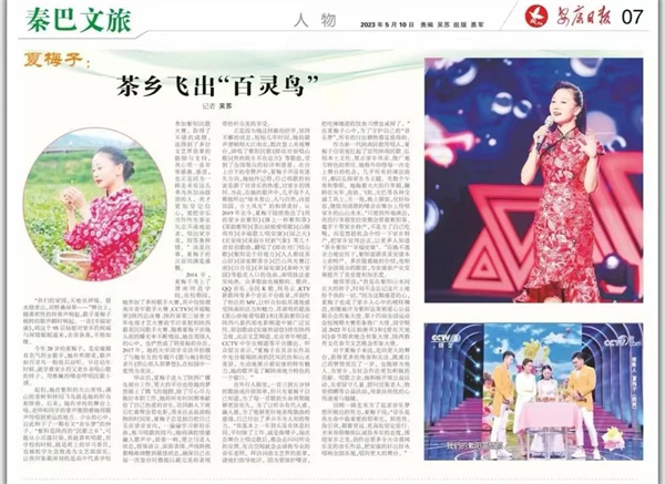 夏梅子曾登上央視宣傳過安康富硒茶,她在CCTV-3綜藝頻道《幸福賬單》欄目演唱陜南民歌并介紹了紫陽富硒茶(綠茶、紅茶)、紫陽金錢橘、紫陽魔芋干、紫陽硒陶等紫陽特產(chǎn)。在才藝展示環(huán)節(jié),夏梅子演唱了由著名作家、書法家、中國作家協(xié)會會員、陜西省民間文藝家協(xié)會專家?guī)斐蓡T曾德強老師創(chuàng)作的《游客醉茶鄉(xiāng)》,她希望更多的人關(guān)注和支持家鄉(xiāng),能夠愛上安康紫陽,愛上紫陽富硒茶。