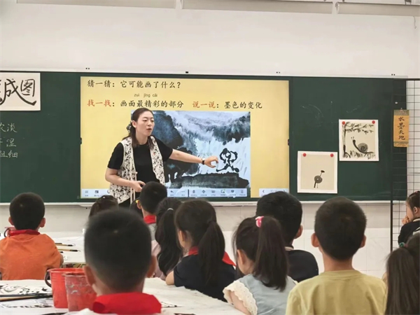 活動中,鐘樓第二實驗小學副校長方文婷和常州經(jīng)開區(qū)教學部主任楊婷老師分別呈現(xiàn)了一年級美術課程《葉子片片》和《練筆成圖》。兩位老師的課程內(nèi)容充滿創(chuàng)新與深度。授課內(nèi)容從印刷術與拓染法相結(jié)合,引導學生們探索美術與生活的緊密聯(lián)系,到通過手指操的引導,幫助孩子們在逐漸掌握水墨畫的基本坐姿和執(zhí)筆方法中感受傳統(tǒng)文化魅力。