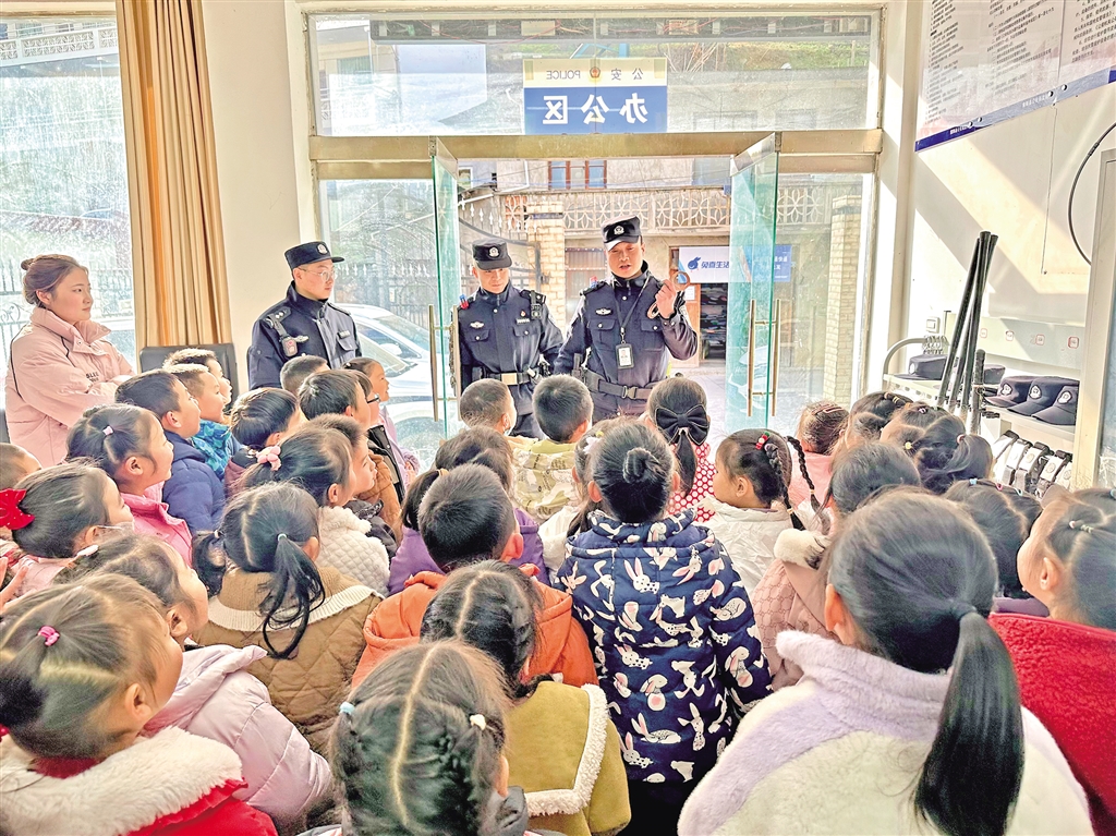 1月8日,紫陽(yáng)縣公安局高橋派出所舉行“萌娃進(jìn)警營(yíng) 警心伴童心”主題110宣傳日警營(yíng)開(kāi)放活動(dòng),邀請(qǐng)轄區(qū)學(xué)校師生走進(jìn)警營(yíng),感受警營(yíng)文化。陳益謙 攝VVF安康新聞網(wǎng)