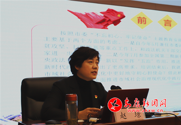 本網(wǎng)訊 11月1日,市委副書(shū)記、政法委書(shū)記趙璟以“推進(jìn)‘五治’融合,打造善治安康”為題,為政法委系統(tǒng)干部講授“不忘初心、牢記使命”主題教育專(zhuān)題黨課。