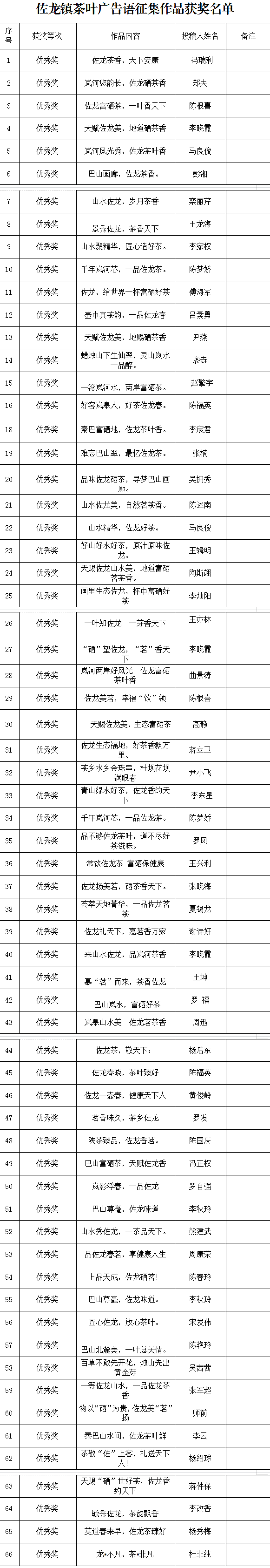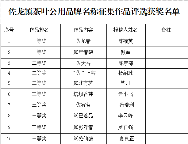 嵐皋縣佐龍鎮(zhèn)黨委、鎮(zhèn)政府在安康日?qǐng)?bào)、安康新聞網(wǎng)發(fā)布《佐龍鎮(zhèn)有獎(jiǎng)?wù)骷枞~公用品牌名稱(chēng)及廣告語(yǔ)公告》以來(lái),得到社會(huì)各界人士的積極響應(yīng)和支持。本次收集到的所有作品,佐龍鎮(zhèn)安排專(zhuān)人逐一按時(shí)間順序統(tǒng)一排序備選,經(jīng)組委初選、專(zhuān)家評(píng)選,已評(píng)選出獲獎(jiǎng)作品擬予以獎(jiǎng)勵(lì),現(xiàn)將擬獲獎(jiǎng)名單進(jìn)行公示,其中一等獎(jiǎng)2名,二等獎(jiǎng)3名,三等獎(jiǎng)5名,優(yōu)秀獎(jiǎng)66名,公示時(shí)間自發(fā)布之日起至2021年12月31日17時(shí)。擬獲獎(jiǎng)名單如下: