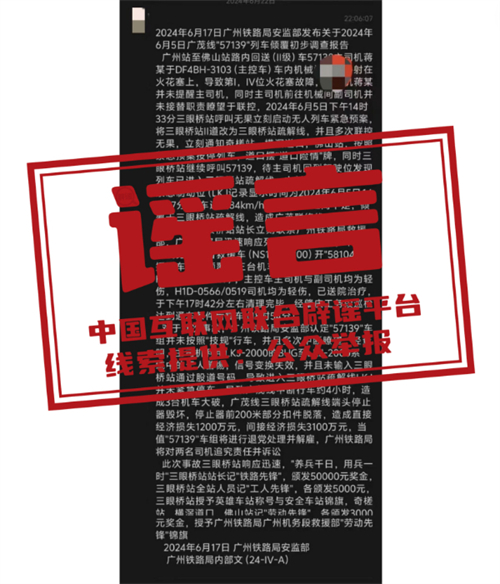 辟謠:網(wǎng)傳“廣州鐵路局安監(jiān)部2024年6月5日廣茂線57139列車傾覆初步調(diào)查報(bào)告”為虛假信息
