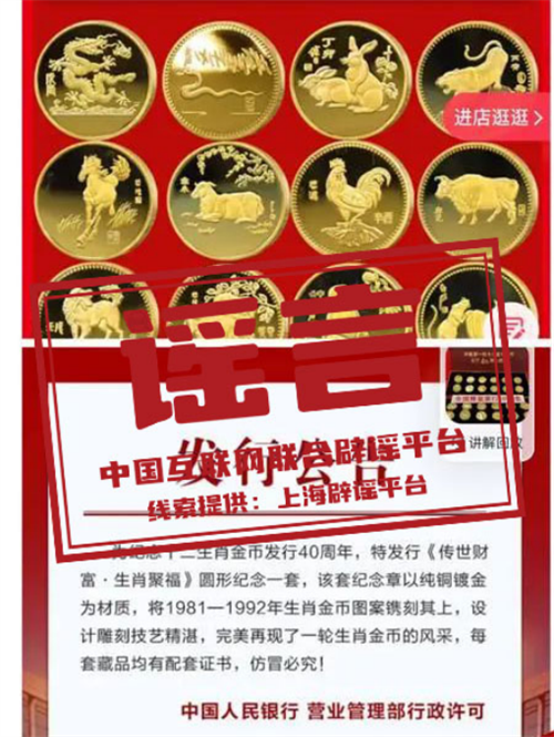 真相:“為紀念十二生肖金幣發(fā)行40周年,特發(fā)行《傳世財富·生肖聚!穲A形紀念章一套”“一次性收齊央行十二生肖紀念幣”……直播間里的各種“紀念幣”,有的甚至帶有“央行發(fā)行公告”等“紅頭文件”,讓人真假難辨。經(jīng)上海網(wǎng)信部門調(diào)查發(fā)現(xiàn),上述網(wǎng)傳商品與央行發(fā)行的紀念幣有著天壤之別。很多商家故意混淆“紀念章”與“紀念幣”、“央行圖樣許可”與“央行發(fā)行”的區(qū)別,誤導公眾。事實上,“紀念幣”由央行發(fā)行,分為普通紀念幣與貴金屬紀念幣,“紀念章”則是商家自行設(shè)計制造的,與央行沒有關(guān)系;而“圖樣行政許可”只是表示央行同意相關(guān)單位在產(chǎn)品上使用人民幣圖樣,并不代表產(chǎn)品由央行發(fā)行。對公眾來說,想要分辨是“央行發(fā)行”還是“商家生產(chǎn)”,一是可以通過央行官網(wǎng)查看每年發(fā)行的普通紀念幣和貴金屬紀念幣項目;二是看紀念幣或紀念鈔是否有面額和貨幣單位,其中貨幣單位為“元”。(來源:“上海網(wǎng)絡(luò)辟謠”微信公眾號)