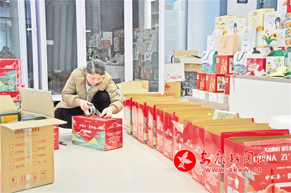 春節(jié)臨近,紫陽(yáng)蒸盆子和年貨大禮包通過(guò)電商走進(jìn)了萬(wàn)戶(hù)百姓家。目前已銷(xiāo)售紫陽(yáng)蒸盆子4萬(wàn)份,年貨大禮包1000余份。圖為工作人員在打包發(fā)貨。彭召伍 攝