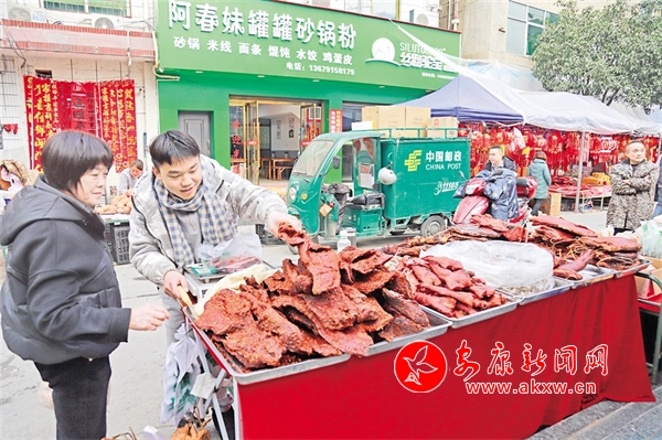 在嵐皋縣城興隆街、建設(shè)路農(nóng)貿(mào)市場,臘肉、香腸、臘排骨、臘豬蹄、血豆腐等等紛紛亮相,為市民提供了豐富的年貨。廖霖 攝Su2安康新聞網(wǎng)