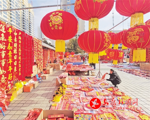 商販在中心廣場售賣春聯(lián)、福字、紅燈籠等節(jié)慶用品。吳定國 攝Su2安康新聞網(wǎng)