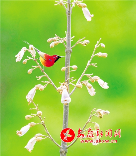 桐花鳳,是經(jīng)常出現(xiàn)在古代文人墨客筆下的吉祥鳥。但因很多人從未見過桐花鳳,遂將桐花鳳與綠毛幺鳳等混淆起來。經(jīng)今人翔實(shí)考證,才證實(shí)古“桐花鳳”就是現(xiàn)今的“太陽鳥”。太陽鳥象征著祥瑞、吉祥和諧、鳳凰齊飛、太陽重升、身化火焰而使人間恢復(fù)光明。它還是熱愛光明、追求光明、獻(xiàn)身光明的象征。太陽鳥也是太陽崇拜和鳥崇拜相結(jié)合的產(chǎn)物。太陽鳥世界共有14種,中國有6種,被譽(yù)為“東方的蜂鳥”“月下老人”,再加上太陽鳥的寓意如此之好,太陽鳥一直受到人們的喜愛與青睞。(圖文 張東風(fēng) )