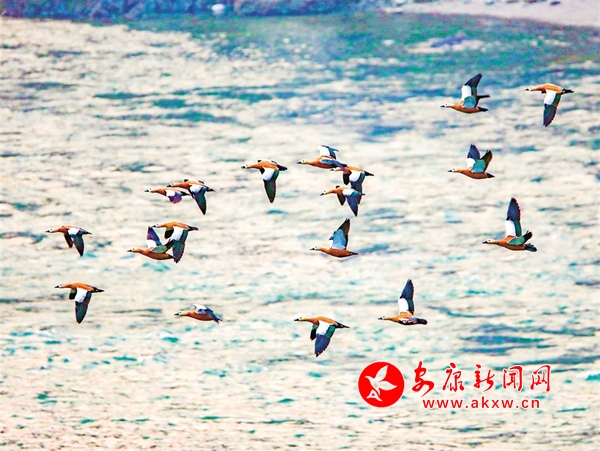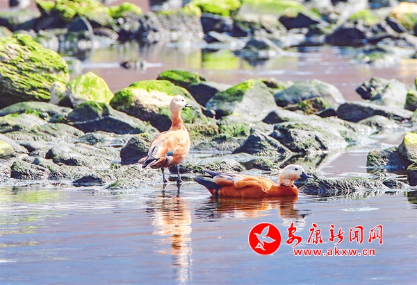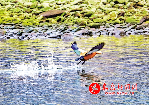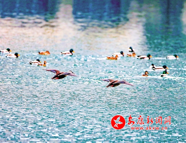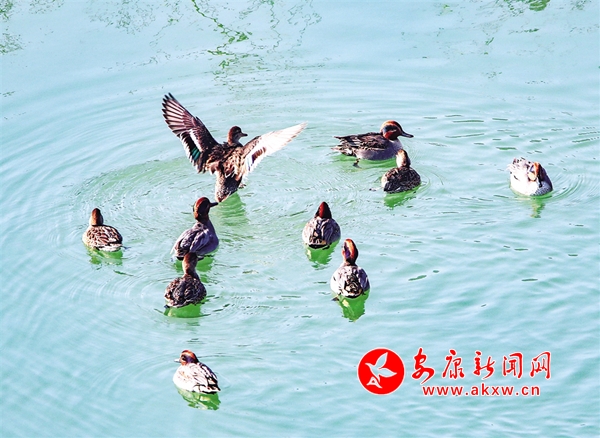 通過攝影鏡頭觀察發(fā)現(xiàn),在大片野鴨群中有綠頭鴨、斑嘴鴨、赤麻鴨等數(shù)10個(gè)種類。它們?cè)谶@里和諧相處,像一個(gè)個(gè)小精靈悠閑自得。一群群野鴨在河里時(shí)而相互追逐,時(shí)而潛水覓食,一會(huì)兒游上岸邊休息,一會(huì)兒展翅飛翔劃過湛藍(lán)的天空,一幅人與自然和諧共生的美麗畫卷在石泉徐徐展開。