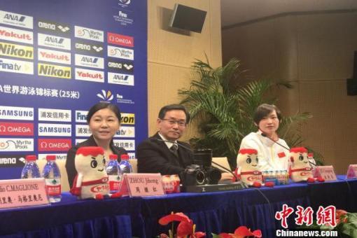 中國游泳協(xié)會(huì)主席周繼紅(左1)和李冰潔(右1)出席發(fā)布會(huì) 馬元豪 攝 中新網(wǎng)杭州12月11日電 (馬元豪)2018年國際泳聯(lián)世界游泳錦標(biāo)賽(25米)(以下簡稱短池世錦賽)……