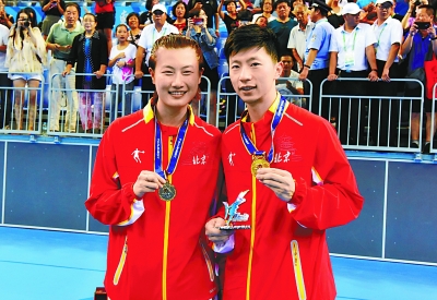 馬龍丁寧賽后合影。本報(bào)記者 和冠欣攝