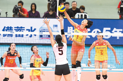 9月10日,在日本名古屋綜合體育館舉行的2017年國際排聯(lián)女排大冠軍杯最后一輪比賽中,中國隊以3比1戰(zhàn)勝日本隊,從而以五連勝的佳績獲該項賽事冠軍。這是中國隊時隔16年再度奪得女排大冠軍杯。圖為中國隊球員袁心玥(上)在比賽中扣球。VJS安康新聞網(wǎng)